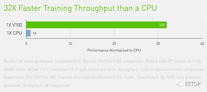 NVIDIA 宣称 V100 的训练吞吐量是普通 CPU 的 32 倍