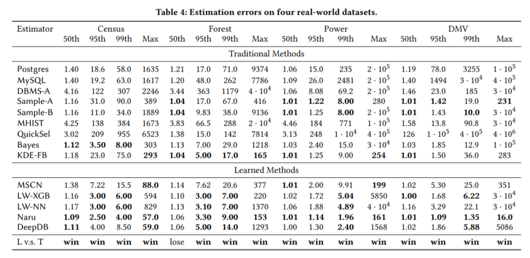 实验表明,学习的方法在几乎所有的数据库系统中都比传统方法的准确度更高,最好的学习的方法可以在最大q-误差指标上超过传统方法14x,在Census、Forest、Power和DMV数据集上,三个数据库系统上分别达到28x、51x、938x和1758x。