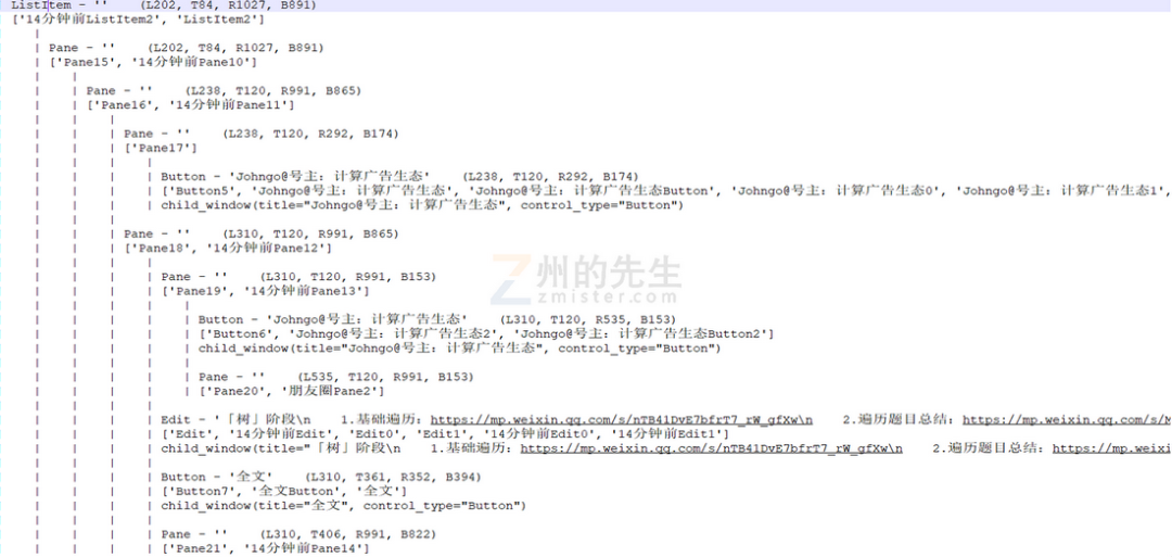 我们先用 .dump_tree() 方法看看朋友圈窗口里面各个控件的结构是怎样的:print(pyq_win.dump_tree())