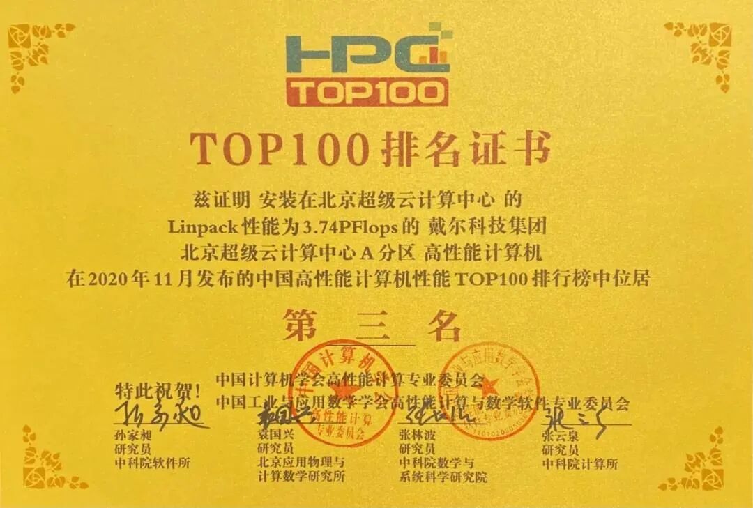 荣获2020 HPC TOP 100排行榜第三名,通用CPU算力第一名