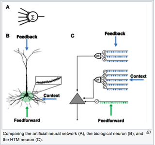 层次时间记忆(HTM)使用稀疏分布式表示法(SDR)对大脑中的神经元进行建模,并进行计算,在标量预测(商品、能源或股票价格等未来值)和异常检测方面优于CNN和RNN。这是Palm Pilot名宿Jeff Hawkins在其公司Numenta的奉献作品。霍金斯在对大脑功能进行基础研究的基础上,追求的是一种强大的人工智能模型,而不是像DNN那样用层和节点来结构。HTM的特点是,它发现模式的速度非常快,只需1,000次观测。这与训练CNN或RNN所需的几十万或几百万次的观测相比,简直是天壤之别。此外,模式识别是无监督的,并且可以根据输入的变化来识别和概括模式的变化。这使得系统不仅训练速度非常快,而且具有自学习、自适应性,不会被数据变化或噪声所迷惑。