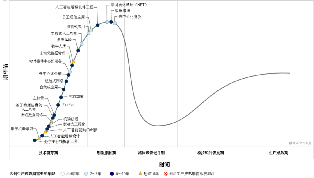 根据全球领先的信息技术研究和顾问公司Gartner最新发布的“2021年新兴技术成熟度曲线”(Hype Cycle for EmergingTechnologies, 2021),建立信任,加速增长以及塑造变革将是三大主要趋势,并可推动企业机构去探索诸如非同质化通证(NFT)、主权云、数据编织、生成式人工智能和组装式网络等新兴技术从而确保竞争优势。
