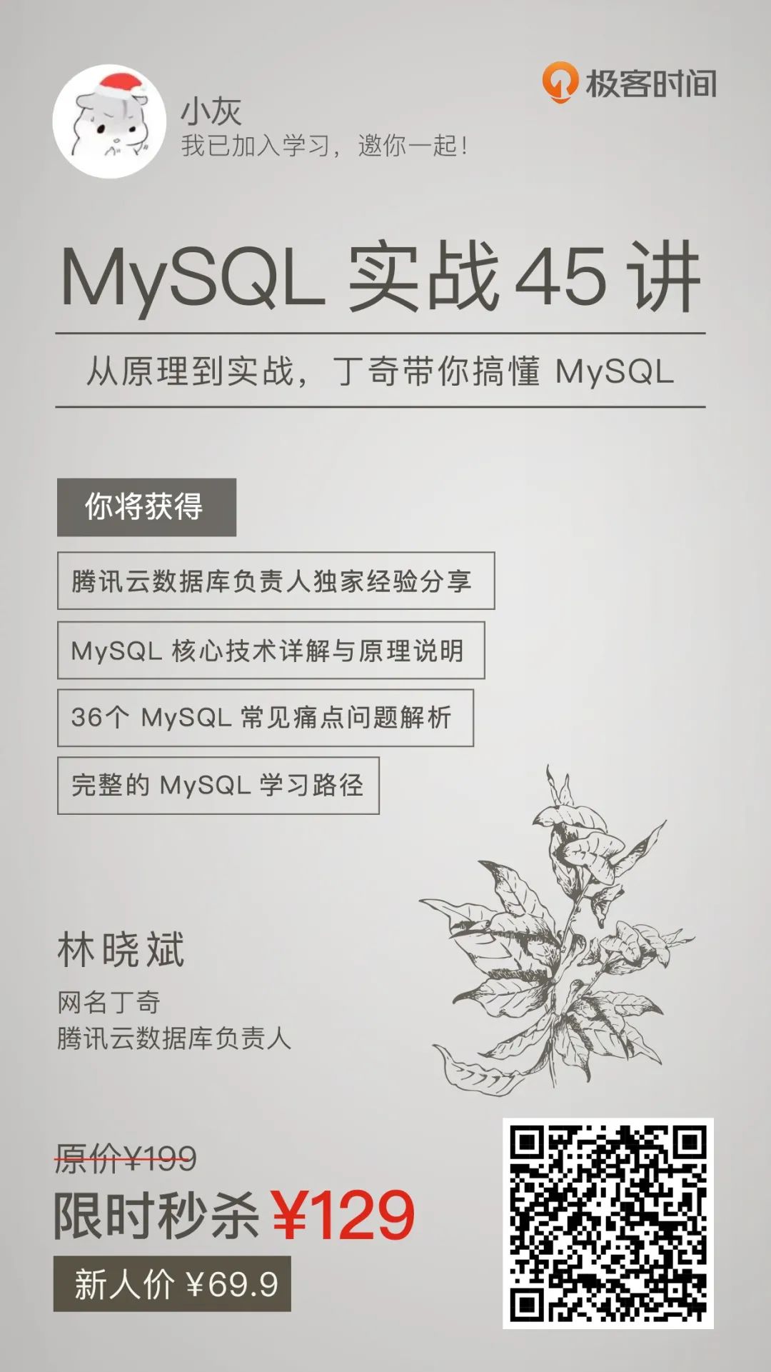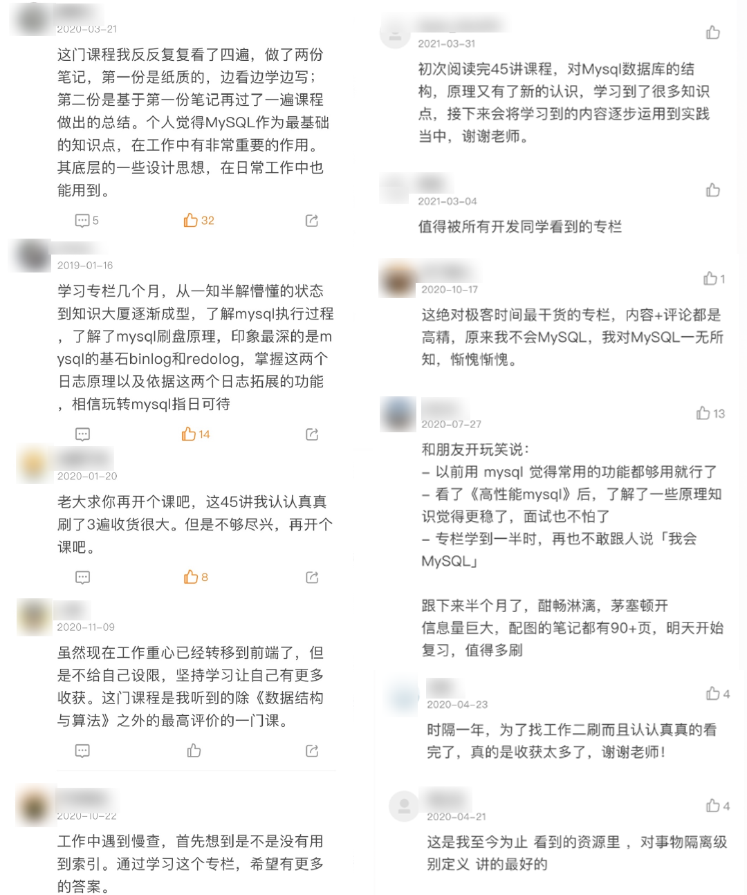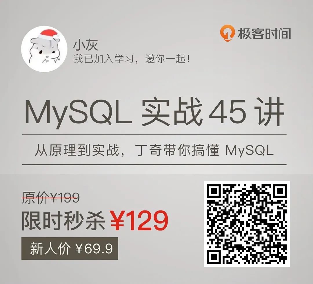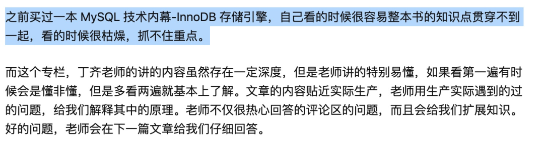 只要能认真跟着学,一定能搞懂 MySQL 中那些经典、巧妙的设计,并且把这些设计思路应用到自己的工作中,可以说是长期的影响到了我。这是极客最早的专栏之一,但真正有价值的内容,是经得起时间检验的。我也曾多次重读,每次都有新收获,从内容到评论留言,都是高精。就像有位读者说的,这是个“值得被所有开发同学看到的专栏”。而且文章中没有理解透彻的问题,都会在评论区找到丁奇给的答案。可以说帮到不少人,截了些评价供你参考,从留言字数,就能看出来,相当走心了。想当年,我们哪有这种待遇,几十块就能获得技术大牛的经验总结。想都不敢想,只能自己摸爬滚打,踩坑试错。所以,真正的好内容,值得被更多人知道。而且一个系统的课,胜过 100 篇干货文章,超过 8W 人在学,又是数据库大佬亲授,绝对错不了。再提醒一下,使用隐藏口令「MySQLyyds」,立省 ¥85,到手 ¥114, 只能帮你到这了!