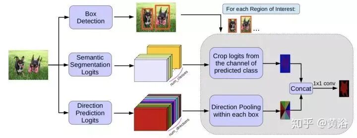 而下面这个是从目标检测算法Faster-RCNN演变的实例分割模型MaskLab,论文发表在去年CVPR‘18: