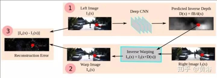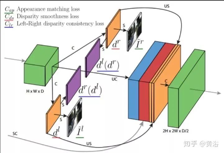 而这个是单目估计深度图的模型:巧妙的是这里利用双目数据做深度图估计的非监督学习
