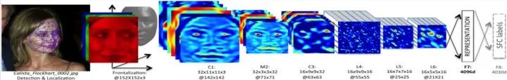 一个完整的人脸识别系统,需要完成人脸检测和人脸校准(face alignment),而后者是需要人脸关键点(facial landmarks)的检测,也是可以基于CNN模型来做。这里以FB的DeepFace模型为例吧,给出一个人脸识别的系统框图: