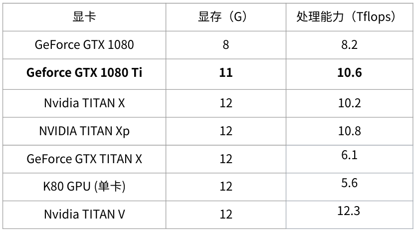- tensorcore的性能目前来看还无法全面发挥出来, 这里不考虑. 其它的tesla系列像P100这些企业级的显卡这里不列了,普通消费者不会买, 而且性价比较低(一台DGX 1上百万.....)