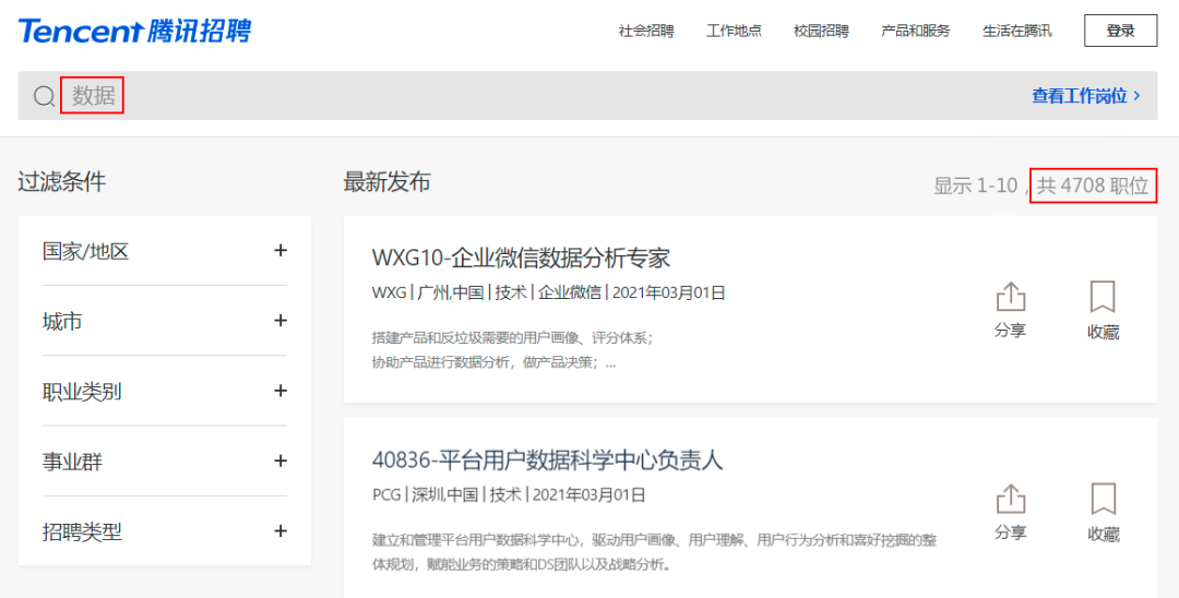 △ 腾讯官网与“数据”相关的岗位需求高达4708个