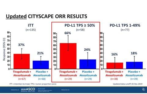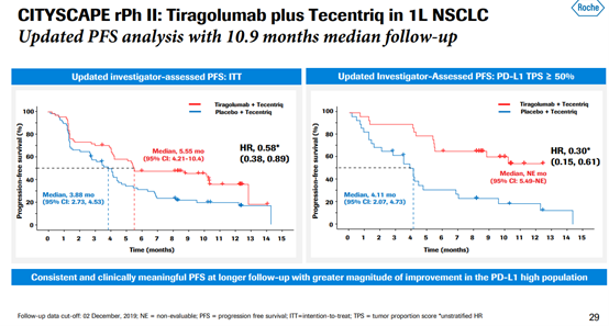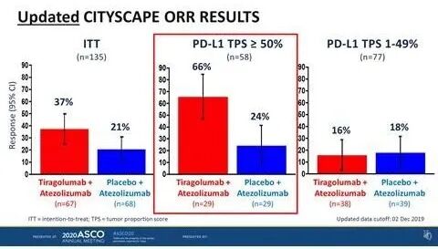 Tiragolumab是一种完全人源的单克隆抗体,而PD-L1也是在免疫系统抑制中发挥作用的蛋白质,Tiragolumab联合Atezolizumab同时阻断TIGIT和PD-L1这两个通路,有可能协同实现T细胞的再活化,增强NK细胞的抗肿瘤活性,达到1+1>2的效果。2020年5月,ASCO年会公布的CITYSCAPE完整结果显示,在平均10.9个月的随访中,与Atezolizumab单药治疗相比,联合用药显示总缓解率(ORR为37% vs Atezolizumab单药治疗的21%)得到改善,疾病恶化或死亡风险(无进展生存期PFS)降低42%。一项在高水平PD-L1(肿瘤比例评分TPS≥50%)人群中开展的探索性分析显示,与Atezolizumab单药治疗相比,ORR具有临床意义(66% vs 24%),与Atezolizumab单药治疗的4.11个月相比,未达到中位PFS(HR=0.30,95%CI:0.15-0.61)。