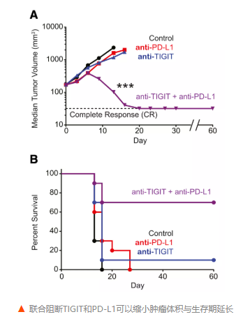结果显示,相比于分别单独阻断TIGIT与PD-1/PD-L1通路,同时使用抗TIGIT抗体和抗PD-L1抗体的抗癌效果显著更好,肿瘤体积缩小和小鼠生存时间改善明显。