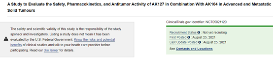 这就意味着,抗TIGIT抗体和抗PD-L1抗体的联合使用,能逆转肿瘤浸润CD8+ T细胞的耗竭状态,恢复其杀伤癌细胞的能力。即,抗TIGIT抗体与抗PD-L1抗体之间存在协同作用。目前全球范围内目前尚无针对TIGIT靶点的药物获批上市,TIGIT在研项目共有20余项,罗氏率先开展的TIGIT抑制剂进入III期临床实验,掀起了全球TIGIT靶点竞争的波澜:2021年8月25日,康方生物在Clinicaltrials.gov网站注册了AK127+AK104联合治疗复发或转移性实体瘤的一期临床,计划入组143例患者。AK104为PD-1/CTLA-4双抗,AK127为TIGIT单抗。