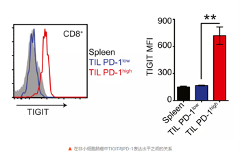 在肿瘤浸润CD8+ T细胞中,仅耗竭性T细胞的TIGIT表达量明显升高,且和PD-1的表达量变化同步,意味着TIGIT与PD-1/PD-L1通路对肿瘤浸润CD8+ T细胞有协同抑制作用。