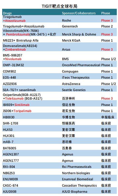 TIGIT单抗药物的研发火热,但其单药疗效不佳,而同时靶向TIGIT以及PD-1/L1却有意外收获,TIGIT研发项目的临床试验多采用与PD-1/L1单抗联用,如上表红色标示。