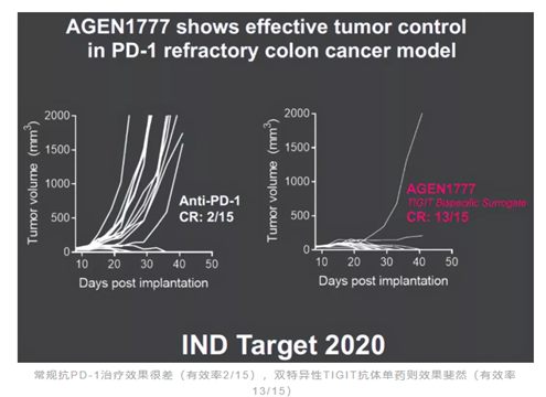 难治性结肠癌的临床前研究中,PD-1抑制剂明显失效的情况下,AGEN1777依然能获得13/15的“完全缓解”率!