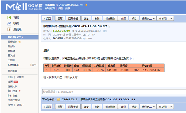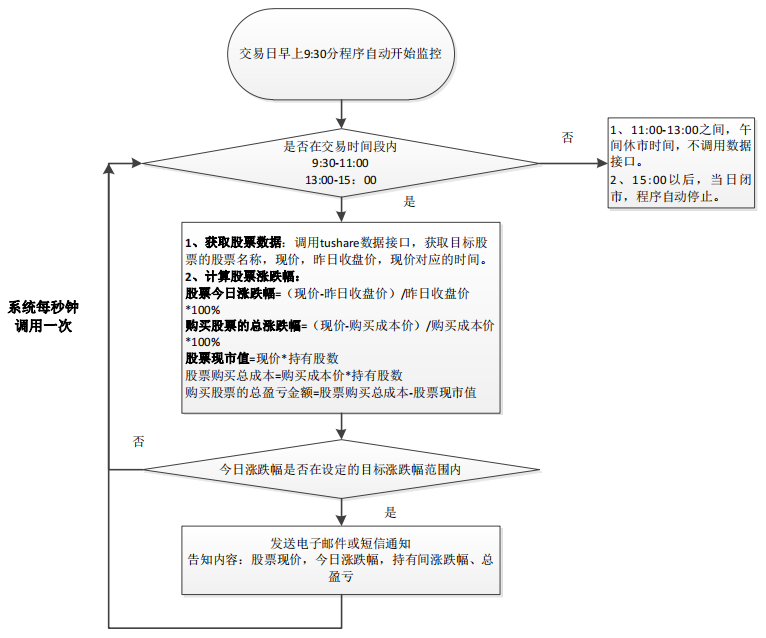 展望该程序只是设置了一只股票来作为简单功能实现的案例,仍然有一定的改进空间,说明如下。一是在实践中,往往都是构建一个股票池(数只股票) 来动态监测股价和自动判断交易时点(比如MACD,均线,KDJ指标等) ,往往需要结合数据库技术,才能便于灵活构造股票池。二是对于发送短信的功能,本文中并未做介绍,仅介绍了电子邮件,其实短信通知的思路和邮件的思路一致。如果要实现免费发短信功能,读者可以在twilio 网站上(https://www.twilio.com)上注册和调用相应功能即可,读者可以再网上搜索。三是关于Tushare数据接口,本文中用的是Tushare老的接口API,目前官方主要维护的是Tushare Pro接口,相应的调用功能要达到一定的积分才可以,但是相比其他收费接口,Tushare是属于业界的良心之作,关于Tushare Pro,参考的网址详见https://waditu.com/document/2。四是其他商业的量化接口,可以推荐聚宽量化接口,大约有半年左右的免费试用期,但是免费过后,每个月还是有几千元的收费,读者可选择使用聚宽网址https://www.joinquant.com/view/community/list?listType=1。五是关于爬虫获取证券交易数据,现在证券交易数据比较丰富的网站有东方财富、同花顺、新浪财经以及和讯网等。通过爬虫也可以获取相应的数据,但是应当注意的是,像本文中每个交易日每秒钟调用一次API,如果用爬虫来实现,就不理想,因为调用太频繁可能触发网站的反爬虫机制。六是该程序设置的是在本地计算机上自动开机运行,在程序不断优化和增加功能后,感兴趣的读者可以了解购买云服务器部署监控程序。注:股市有风险,投资需谨慎。本文只进行技术探讨,不提供任何投资建议。