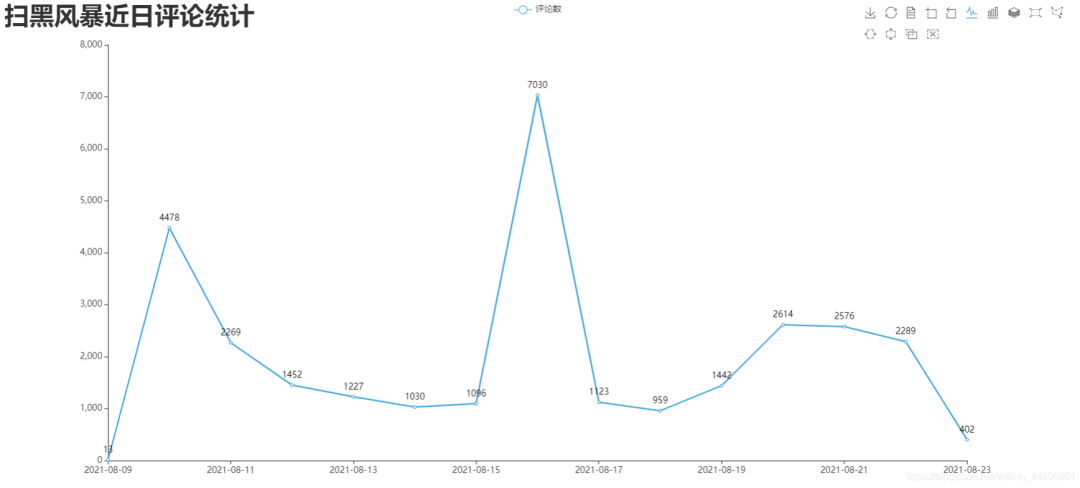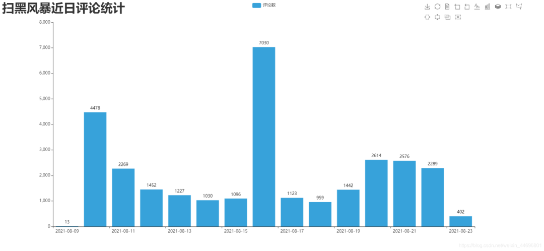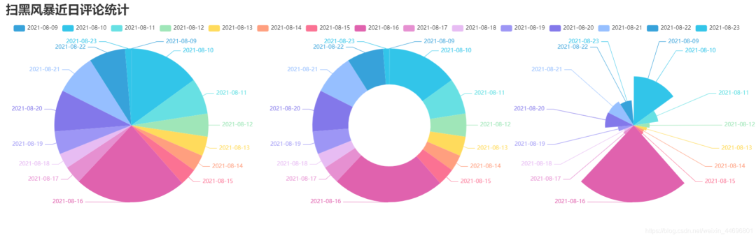 num = y1 lab = x ( Pie(init_opts=opts.InitOpts(width='1700px',height='450px',theme=ThemeType.LIGHT))#默认900,600 .set_global_opts( title_opts=opts.TitleOpts(title="扫黑风暴近日评论统计", title_textstyle_opts=opts.TextStyleOpts(font_size=27)),legend_opts=opts.LegendOpts(