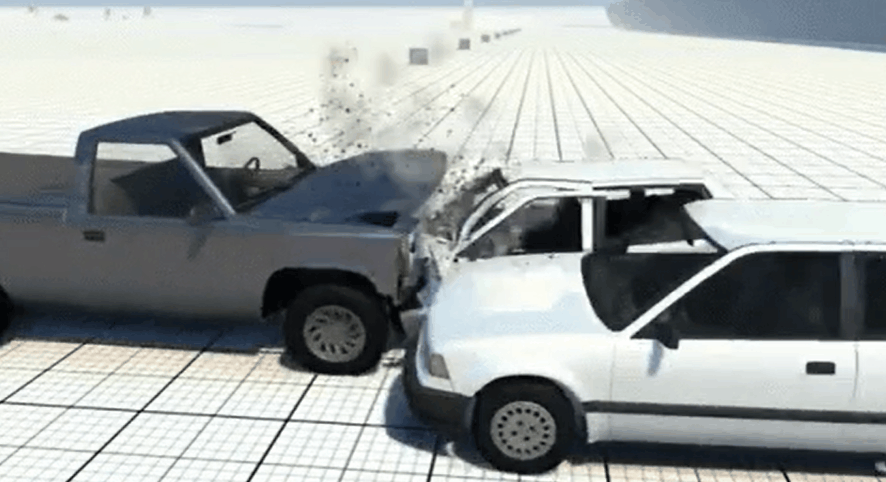由命名可知,弹簧相互连接的点的质量系统代表模型检测的目标,我们可将其视为三维胡克定律网络。胡克定律是力学弹性理论中的一条基本定律,它表明受力固体材料中的应力与应变(单位变形量)之间成线性关系。该模型的主要缺点是建立质量弹簧网络时需要大量的人力成本,并且材料特性与模型参数之间没有严密的逻辑关系。但尽管如此,该模型在“BeamNG.Drive”赛车游戏中也达到了非常不错的效果,如下图,基于弹簧-质量模型的实时车辆模拟器,可用于模拟车辆变形。(Position-bsed Dynamics,PBD)运动学模拟的方法通常基于力学模型,如粒子加速度遵循牛顿第二定律计算,通过积分计算获取每个时刻的速度和位置。在基于位置的动力学,通过求解约束方程的准静态问题来计算位置。PBD方法的精确度较低,但计算速度优于基于强制的方法,因此非常适合游戏、动画电影等视觉场景。游戏中人物的头发、衣服的运动通常都是采用该模型来实现。PBD不仅局限于可变形固体,还可用于模拟刚体物体和流体。更多内容可参考这篇关于PBD方法的综述[2]。
