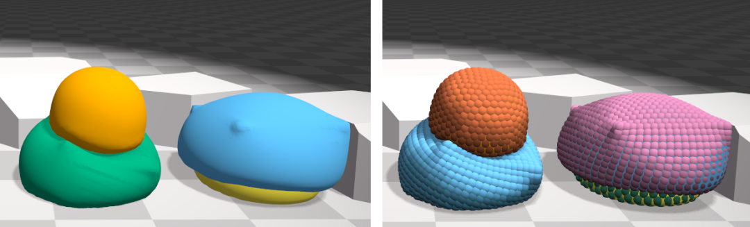 MPM是一种高精度的无网格方法,它比基于网格的方法更适合模拟变形、断裂、多材料系统和粘弹性流体,因为运行效率和分辨率更高。MPM是目前最先进的无网格混合欧拉/拉格朗日的方法,是细胞内粒子(PIC)和流体隐式粒子(FLIP)等传统方法的升级。MPM模拟不是实时运行的,在一个含有一百万个点的系统中,MPM每帧大约需要半分钟。详细内容可见MPM综述文章[3]。