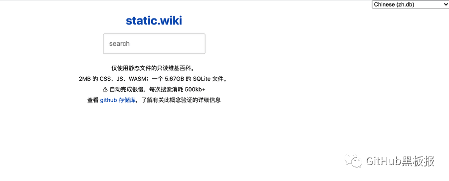 今天要推荐的项目跟维基百科有关系,也是一项技术的概念验证,使用 GitHub Pages 搭建一个离线版本的静态维基百科。访问 http://static.wiki/zh 可以直接试用,页面右上角可以直接切换语言。