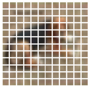 print(f"Elements per patch: {patches.shape[-1]}") n = int(np.sqrt(patches.shape[1]))plt.figure(figsize=(4, 4))for i, patch in enumerate(patches[0]): ax = plt.subplot(n, n, i + 1) patch_img = tf.reshape(patch, (patch_size, patch_size, 3)) plt.imshow(patch_img.numpy().astype("uint8")) plt.axis("off")