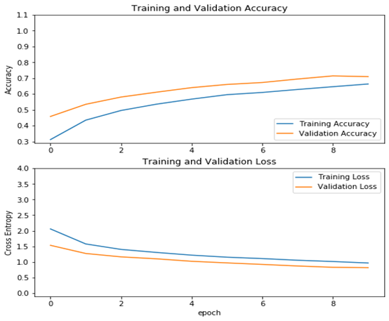 acc = history.history['accuracy']val_acc = history.history['val_accuracy'] loss = history.history['loss']val_loss =history.history['val_loss'] plt.figure(figsize=(8, 8))plt.subplot(2, 1, 1)plt.plot(acc, label='Training Accuracy')plt.plot(val_acc, label='Validation Accuracy')plt.legend(loc='lower right')plt.ylabel('Accuracy')plt.ylim([min(plt.ylim()),1.1])plt.title('Training and Validation Accuracy') plt.subplot(2, 1, 2)plt.plot(loss, label='Training Loss')plt.plot(val_loss, label='Validation Loss')plt.legend(loc='upper right')plt.ylabel('Cross Entropy')plt.ylim([-0.1,4.0])plt.title('Training and Validation Loss')plt.xlabel('epoch')plt.show()