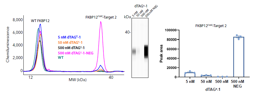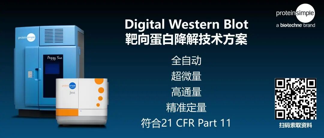 本团队建议高通量筛选平台需与其他技术平台配合使用,才能更充分表征异双功能蛋白降解剂。如采用Digital WB确认内源性蛋白质降解,以确保与初步筛选实验中利用HiBiT高通量技术获得一致性实验结果,防止初级筛选试验中数据结果被错误解读。不管首选策略是什么,随着未来几年靶向蛋白降解领域的研究不断加强,利用更高通量技术和更自动化平台来加速药物发现是一项有价值的投资。