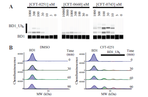 对于靶向蛋白质降解的细胞学实验,384孔板可显著缩短实验时间。使用合适的抗体,通过使用针对靶蛋白翻译后修饰的抗体来区分靶标蛋白。例如使用特异性识别磷酸化蛋白的抗体直接评估具有自磷酸化活性激酶的化合物BiDAC抑制和降解影响,可与总蛋白(磷酸化和未磷酸化)测量值进行比较。获得这两个数据可能会提高降解剂与抑制剂前体区分机制的理解,进一步了解目标蛋白调节对表型影响。