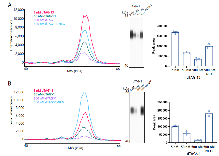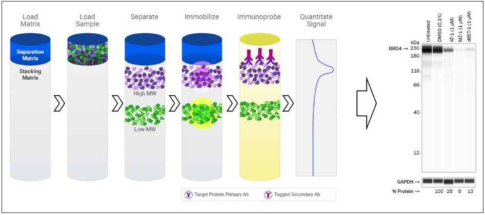 Digital WB技术是传统WB实验系统的高效替代方案。使用该技术,可在同一根毛细管中完成样品分离、捕获、固定、免疫检测和定量分析,从而实现传统WB的所有实验步骤(包括蛋白质上样、分离、免疫印迹、洗涤、检测以及数据分析)自动化,有效提高蛋白质表达定量结果的精确性和重复性。全自动Digital WB技术显著地缩短了样本检测时间到3小时,直接采集化学发光或荧光信号值,利用数字化信号峰面积来表征蛋白含量,短时间内实现了目的蛋白的可视化精准定量分析。ProteinSimple旗下具有系列的Digital WB系统,从25到96个样本通量,可满足靶向蛋白降解药物研发过程中对中低通量检测需求。