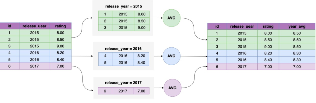 +------+--------------+--------+-------------------+| id | release_year | rating | year_avg |+------+--------------+--------+-------------------+| 1 | 2015 | 8 | 8.5 || 3 | 2015