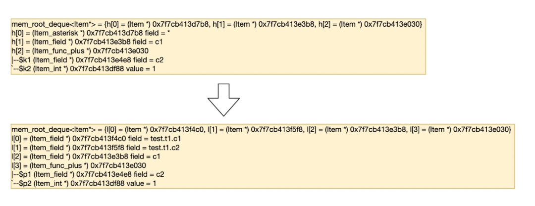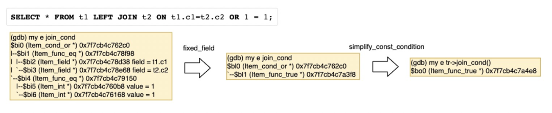 setup_join_cond如果有nested_join会递归调用setup_join_cond进行解析和设置。这里也顺带介绍下simplify_const_condition函数的作用,如果发现可以删除的const Item,则会用Item_func_true/Item_func_false来替代整个的条件,如图。
