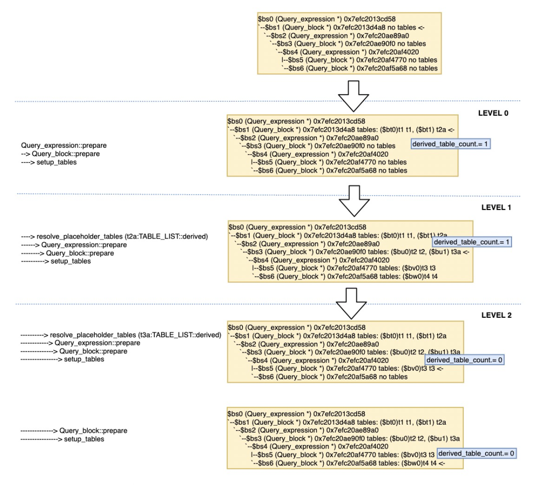 - check_materialized_derived_query_blocks(): 设置属于当前Derived Table所在的查询块结构。