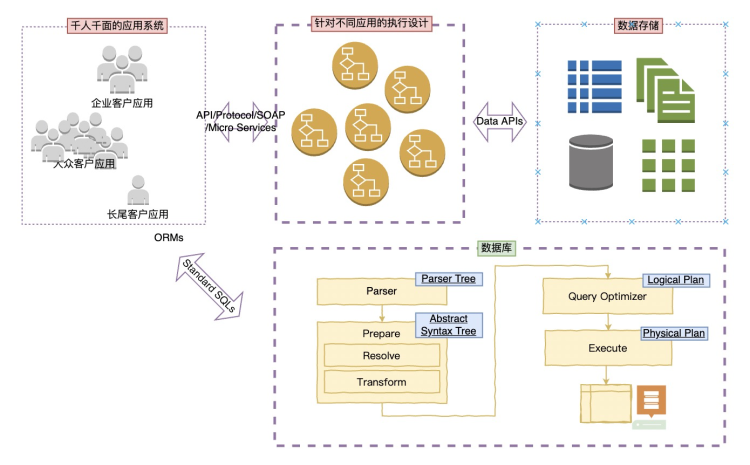 我们都知道,利用编写程序来动态实现我们应用所需要的逻辑,从而程序执行时得到我们需要的结果。那么数据库就是一种通过输入SQL字符串来快速获取数据的应用。当然,假设没有数据库这种系统应用,用程序如何实现呢?我们可能会发现,即使不管数据如何存储、数据是否并发访问,仍然需要不断通过修改程序处理不同应用对数据的不同请求。比如大数据领域,我们通常通过非关系型数据库的API,实现对数据的获取。然而这种方式虽然入门简单,但是维护极难,而且通用性不强,即使不断进行软件架构设计或者抽象重构,仍然需要不断地变换应用,这也是为何非关系型数据库回头拥抱数据库SQL优化器的原因。