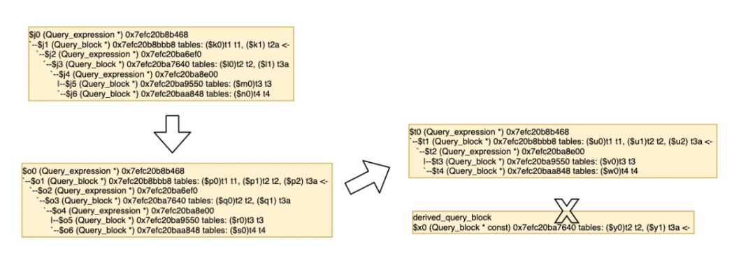 前面已经介绍过resolve_derived()的作用,我们重点介绍merge_derived()函数,merge_derived是改变Query_expression/Query_block框架结构,将derived table或者view合并到到query block中。merge_derived 处理和合并Derived table