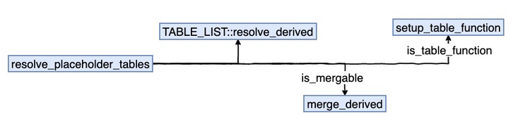 - resolve_placeholder_tables/merge_derived/setup_table_function/setup_materialized_derived : Resolve derived table, view or table function references in query block.