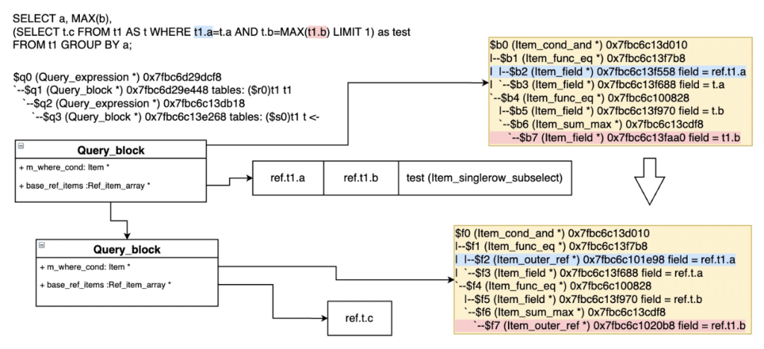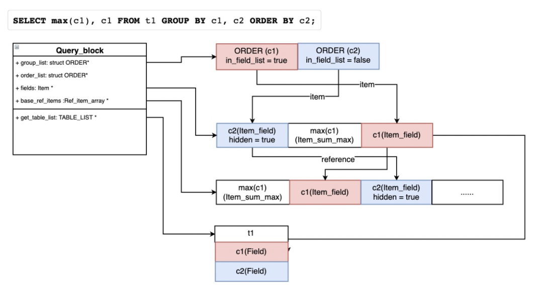 base_ref_items记录了所有Item的位置,方便查询块的其他Item可以进行引用,或者通过Item_ref及其Item_ref子类进行直接引用,例如子查询的引用(Item_view_ref)、聚合函数引用(Item_aggregate_ref)、外查询列的引用(Item_outer_ref)、subquery 子查询产生NULL value的引用辅助(Item_ref_null_helper)。