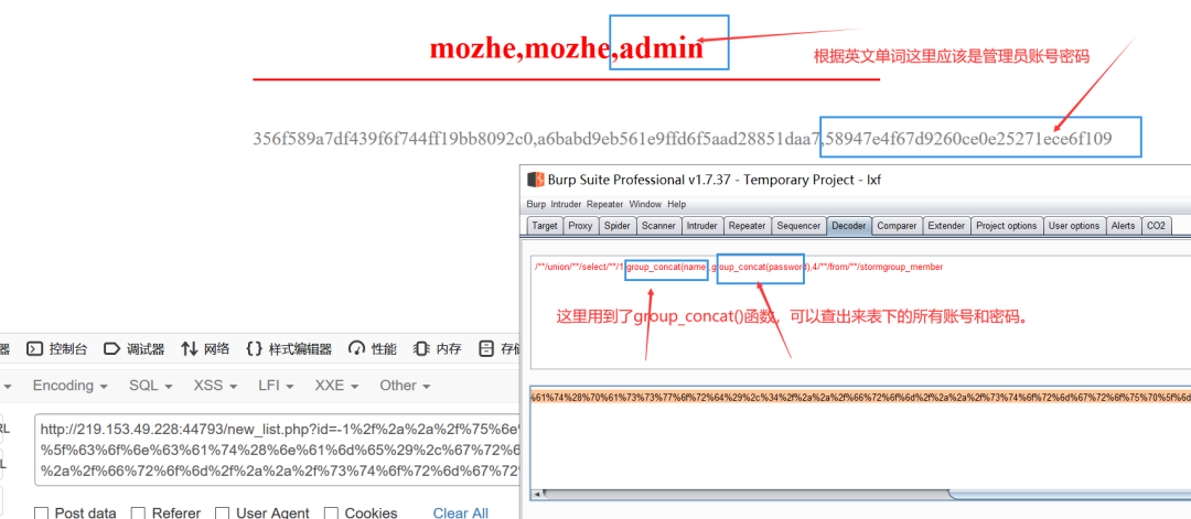 这里咱们还用到了group_concat()函数,可以查询出所有账号和密码。构造如下语句。