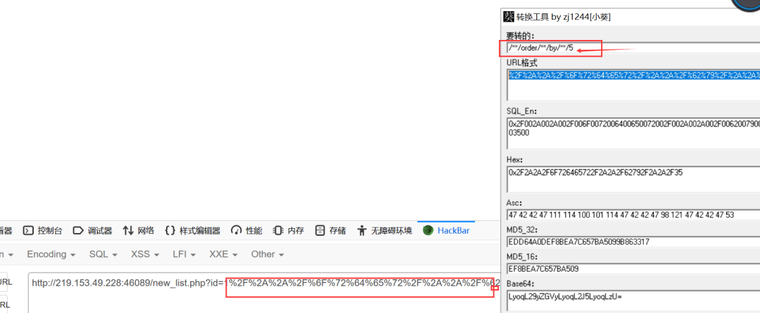通过测试发现,这里过滤了空格和等于号。所以咱们用/**/代替空格,用like代替=,最后将构造的语句进行url编码,使用的是小葵转化工具。