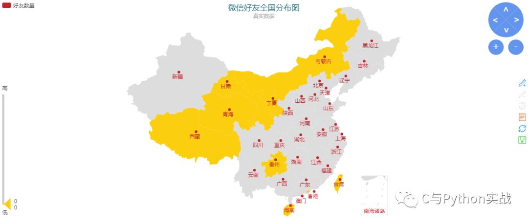 有趣的是,地图左边有一个滑块,代表地图数据的范围,我们将上边的滑块拉到最下面可以看到没有微信好友分布的省份:
