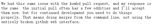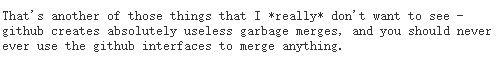 【导读】Linux 之父 Linus 最近在邮件列表中又炮轰 GitHub,直指 GitHub 的合并机制,直言只能产生绝对无用的「垃圾」信息,并告诫后来人:永远不要使用 GitHub 界面来 merge 任何东西!