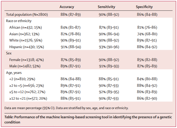 研究结果显示,在整个人群中,该系统检测遗传疾病的平均准确率为88%,敏感性为90%,特异性为86%。其中,白色人种和西班牙裔的准确率高于非洲和亚洲人群,这可能是由于在数据集中后两者的图像信息较少造成的。除此之外,男性和女性之间的预测准确率相似,2岁以下儿童和2岁或2岁以上儿童之间的预测准确率也相似。
