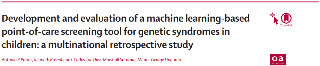 1. Antonio R Porras et.al. Development and evaluation of a machine learning-based point-of-care screening tool for genetic syndromes in children: a multinational retrospective study. The Lancet Digit Health. 20212. Gonzaludo N Belmont JW Gainullin VG Taft RJ. Estimating the burden and economic impact of pediatric genetic disease. Genet Med. 2019; 21: 1781-1789.3. Gurovich Y Hanani Y Bar O et al. Identifying facial phenotypes of genetic disorders using deep learning. Nat Med. 2019; 25: 60-64