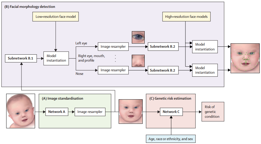 该数据集包括根据每个机构的临床诊断标准来确诊的遗传疾病儿童,以及按年龄、性别、种族或种族匹配的无遗传综合征对照组的照片。研究团队根据44个面部特征从照片中量化面部表型,并设计了一个深度学习架构。该架构由三个神经网络组成,分别执行图像标准化 (网络A)、面部形态学检测 (网络B) 和遗传综合征风险估计 (网络C)。