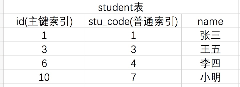以Student表作为样例数据,id为主键,stu_code为学生编号,添加普通索引。