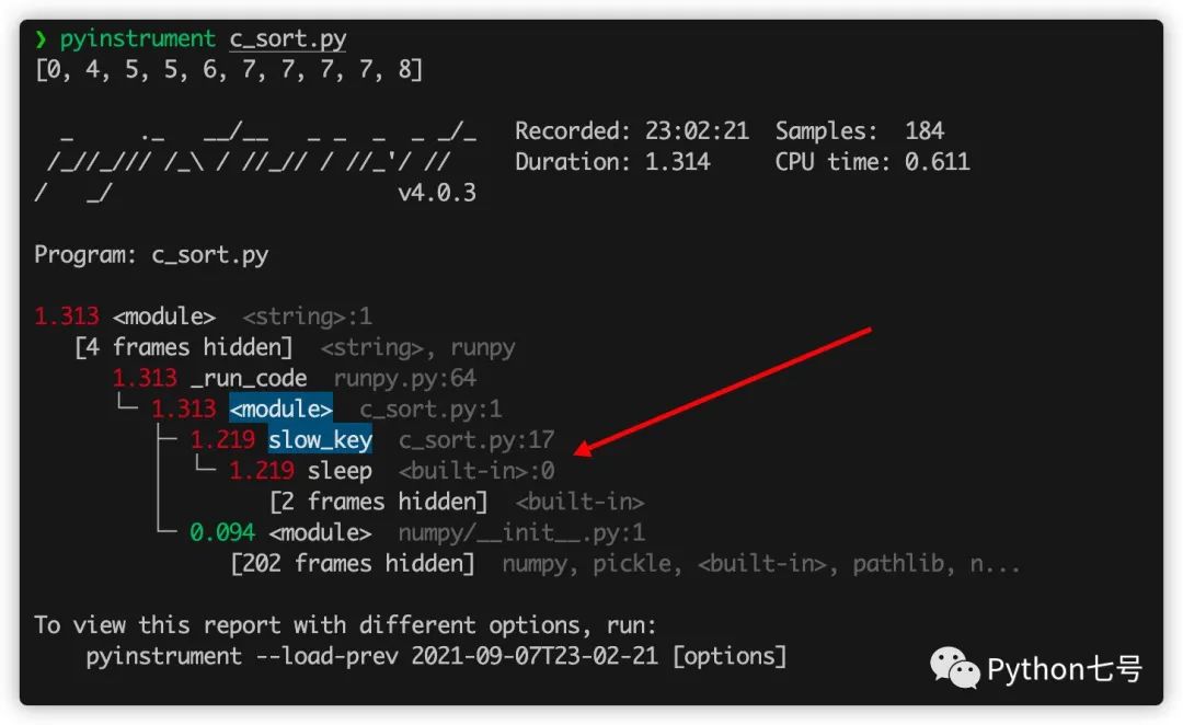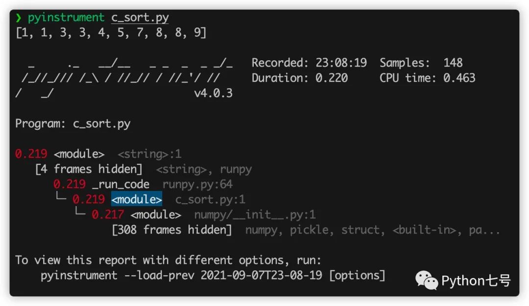 上述分析需要修改源代码,如果你使用命令行工具,就不需要修改源代码,只需要执行 pyinstrument xxxx.py 即可: