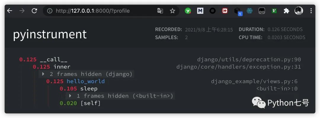 看完是不是还是一脸懵逼,通常很难理解您自己的代码如何与这些跟踪相关联。Pyinstrument 记录整个堆栈,因此跟踪昂贵的调用要容易得多。它还默认隐藏库框架,让您专注于影响性能的应用程序/模块: