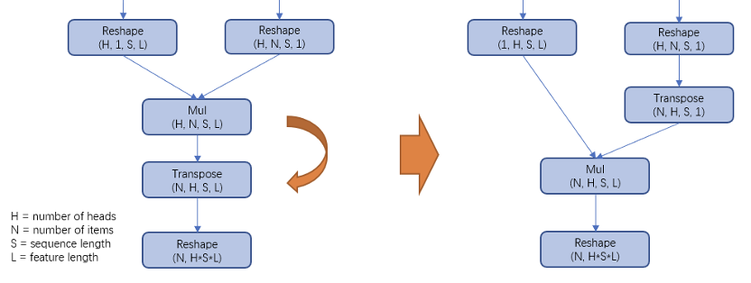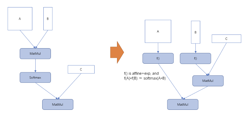 非排他索引:ragged tensor 上述数据结构只能表达树的结构,也就是排他的索引:每两个聚类之间不能存在交集。如果算法上放宽这条限制,索引结构就会变成图,上述的数据结构就无能为力了。这种情况下,我们可以使用TF原生的 ragged tensor 来表示这个索引,即第i行表示第i个节点的子节点序号。在这种表示下,对子节点的查找可以通过 gather+flat+unique 来进行。这样做的效率会低于上一节中的数据结构,但由于索引计算的占比不大,性能差异尚可以接受。 3. 访存优化 在优化的过程中,我们发现主要瓶颈都集中在显存带宽上。此模型对显存带宽的占用达到90%以上,触及天花板。为了减少访存带宽,我们运用了下面三种图优化的手段,通过数学上的等价变换,尽可能减少中间结果大小。 交换 broadcast 与 transpose 这样 elementwise multiply + transpose 的结构出现在 attention 中,这里的 elementwise multiply 包含一个隐式的 broadcast,使得之后的 transpose 所要移动的内存量增加了L倍。这里我们可以交换这两个op的位置,先做 transpose,这样可以避免隐式 broadcast 带来的内存膨胀的问题。 核函数近似与交换矩阵乘顺序 一般来说,对于 linear 或者 elementwise 的op,我们会比较容易做数学上的变换从而进行各方面优化。注意到 attention 中存在 softmax(AB) 的结构,它是一个核函数,可以表示成内积形式。因此我们将原本的 softmax(AB)*C 近似替换成了f(A)*f(B)C[4]。由于这里A矩阵较大的,而B和C矩阵较小,我们可以根据矩阵乘的结合律按照 f(A)(f(B)*C) 的顺序计算,从而保证中间结果也维持在了较小的规模。 拆分 tile+concat+matmul DNN 第一层的 matmul 是整个模型中最大的op,它是输入是由两个两部 concat 而来的。第一部分的 batchsize 是1,而第二部分的 batchsize 高达数万,而在 concat 前会将前者复制多份(tile操作),从而使其 batchsize 与后者保持一致。观察到 tile,concat,matmul 都是线性操作,因此可以将这个过程进行线性变换,将两个部分分开计算后再合并,这样就避免了第一部分的复制操作,节省了大量的计算和内存资源。 4. Beam Search 宽度的调节 由于访存的消耗都与打分量成正比,最直接有效进行优化的方式就是控制打分量,也就是 beam search 的宽度。最终选出的广告只有数百个,而目前 beam search 的宽度在数万的级别,相当于只选出了前几十分之一。考虑到缩小打分量可能会影响召回的效果,所以我们考察了召回率随之变化的情况,如下表。可见即使将宽度缩小一半(表上从15W缩减到7.5W),召回率也不会相差太多。 总打分量 1W 1.5W 2W 2.5W 7.5W 15W 全库检索 召回率 0.382 0.464 0.510 0.521 0.541 0.545 0.580