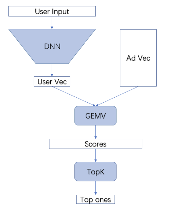 ▐ 背景阿里妈妈展示广告召回大多采用 Tree-based Deep Model(以下简称TDM)模型,它通过对候选广告的聚类,构造了深达十余层的二叉树索引,并使用 beam search 在此索引上进行检索[1]。由于线上服务的 latency 约束及当时的硬件算力限制使我们不能直接对整个候选集(百万甚至千万量级)进行模型打分。 随着近几年硬件(GPU & ASIC)的发展,我们在模型上的计算能力有了很大提升。于是,算法同学从扩大打分量和提升模型复杂度的两个方向对目前的模型进行了升级。第一个方向是进行全库打分,即抛弃索引结构,用相对简单的双塔模型一次性给所有广告打分;第二个方向诞生了索引扁平化项目,保留树结构索引的同时将其扁平化,减少 beam search 的深度并增加宽度,同时引入 attention 计算,增加了打分模型的复杂度。 这些给工程优化提出了很高的要求,也带来很大挑战。首先,模型大小和计算量的暴增,使得打分的广告数成倍增长,模型的复杂度也大大增加,例如索引扁平化模型中,单次打分消耗的浮点计算次数(FLOPs)就要比原 TDM 模型增长约十余倍。其次,模型中引入了一些非典型的非数值计算(比如TopK和beam search),这些计算如果只使用TensorFlow原生算子会带来性能热点,使 latency 过长(数十上百毫秒)无法满足线上服务的要求。 本文主要分享我们是如何通过系统和算法的协同设计,逐一解决这两个模型在上线过程中的工程难点,为广告召回业务迭代打开新的空间。 ▐ 路径一: 全库模型 1. 模型结构介绍 由于每一次用户 page view 模型计算需要处理所有的广告,对于在线系统来说打分量过于巨大(百万至千万量级),只能采用相对简单的模型结构,这里我们选用了经典的双塔模型结构:用户特征和广告特征分别经过DNN得到特征向量,用这两个向量的内积表示匹配程度,并由TopK从中选出最大的那部分。由于广告特征都是固定的,所以广告所在那一路的 DNN 可以在离线提前算完,线上模型直接拿到所有广告的向量作为常量模型参数。如下图所示。 此模型最大的性能挑战来自于 TopK。由于规模达到了数百万,如使用 TF 原生 TopK 算子,其实现并不适合我们的数据特点,latency 将高达数十 ms,不满足线上服务的要求。第二个挑战来自于内积,它是全模型计算量和访存量最大的部分,对于它的处理也相当重要。 2. 对于 TopK 的优化 总体思路 首先,我们调研了 TF 的原生 TopK 算子(即tf.math.topk())的 GPU 实现。它是由若干 RadixSort 组成,其时间复杂度也的确与输入规模n成线性,如下表所示。 规模 10W 20W 50W 100W 200W 500W 1000W latency(ms) 0.926 1.825