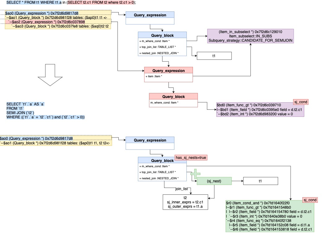 - Convert semi-join subquery predicates into semi-join join nests. Convert candidate subquery predicates into semi-join join nests. This transformation is performed once in query lifetime and is irreversible.