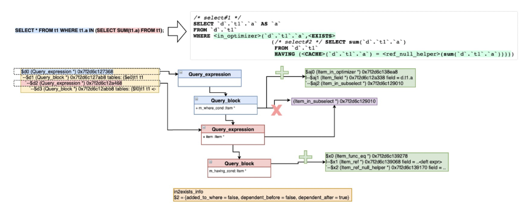 - 如果子查询包含聚合函数、窗口函数、GROUP语法、HAVING语法,将判断条件加入到HAVING子句中,另外通过ref_or_null_helper来区分NULL和False的结果,如需要处理NULL IN (SELECT ...)还需要封装到Item_func_trig_cond触发器中。